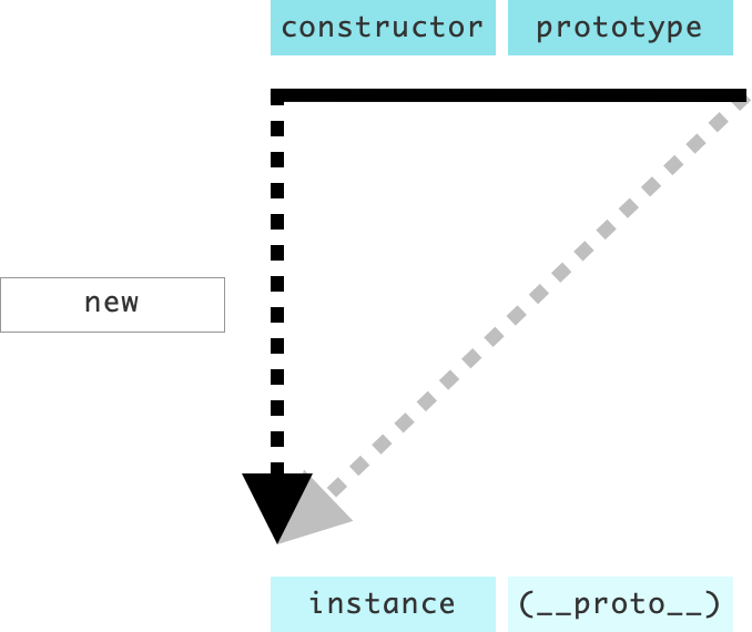 위 그림대로 new 연산자로 constructor를 호출하면 instance가 만들어지고, 이 instance가 가지고 있는 생략 가능한 프로퍼티인 __proto__는 constructor의 prototype을 참조합니다.